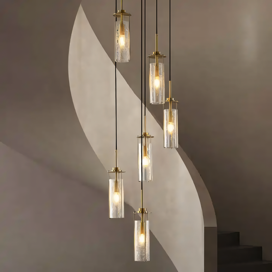 6 Light Brass Gold Crackle Glass Double Height Stair Chandelier