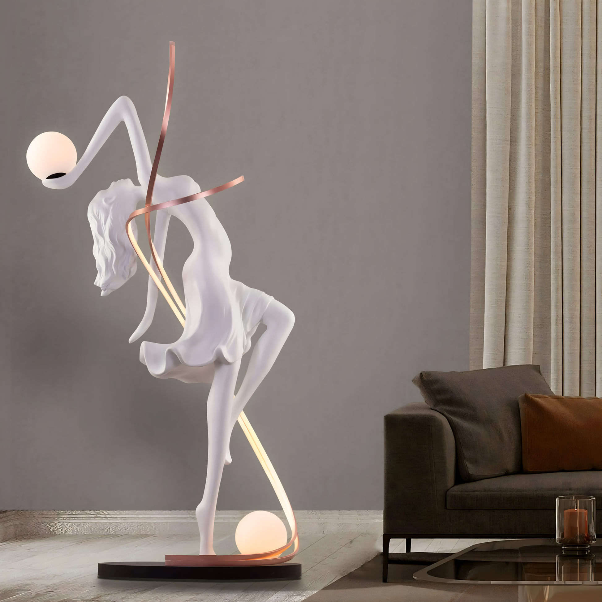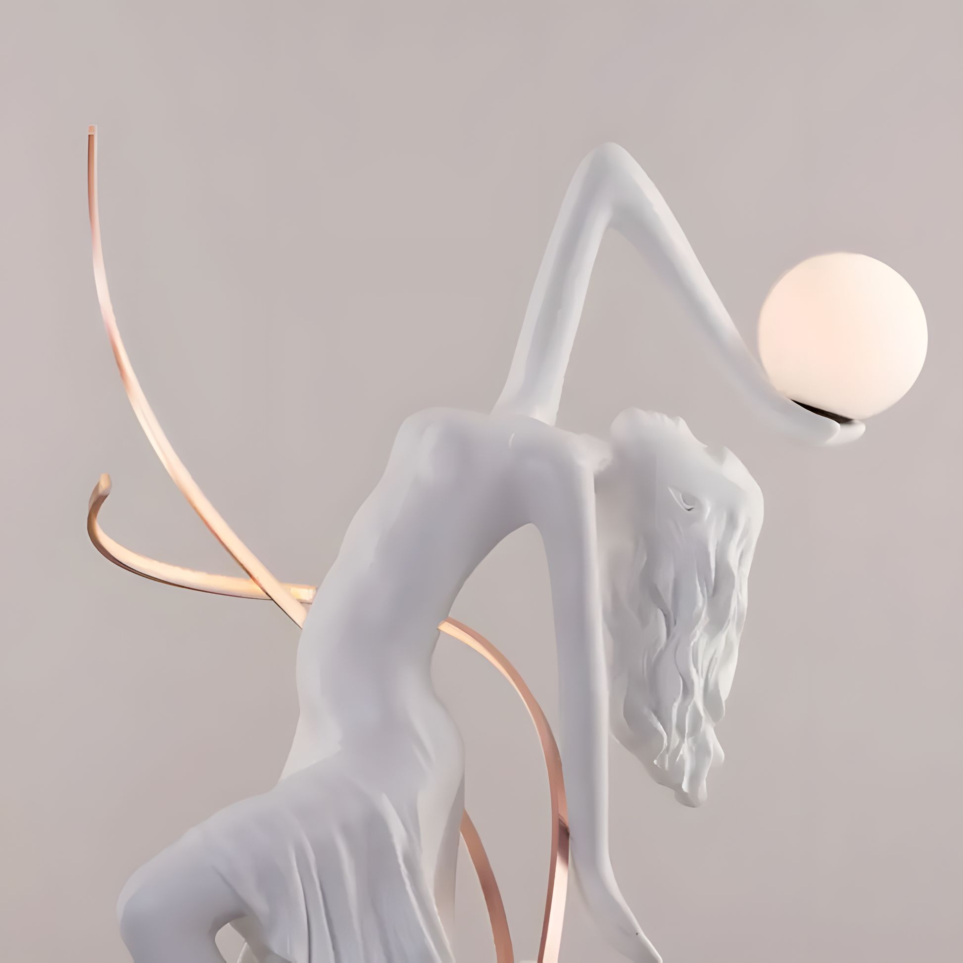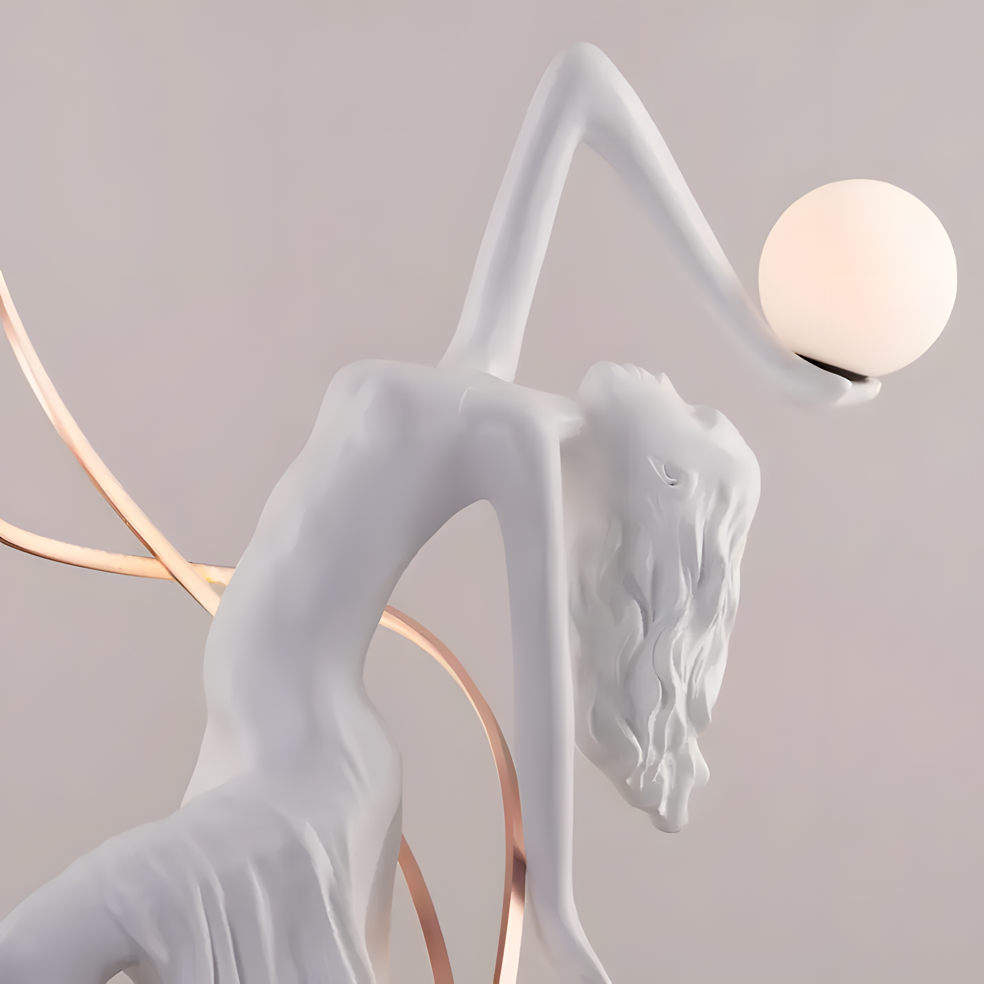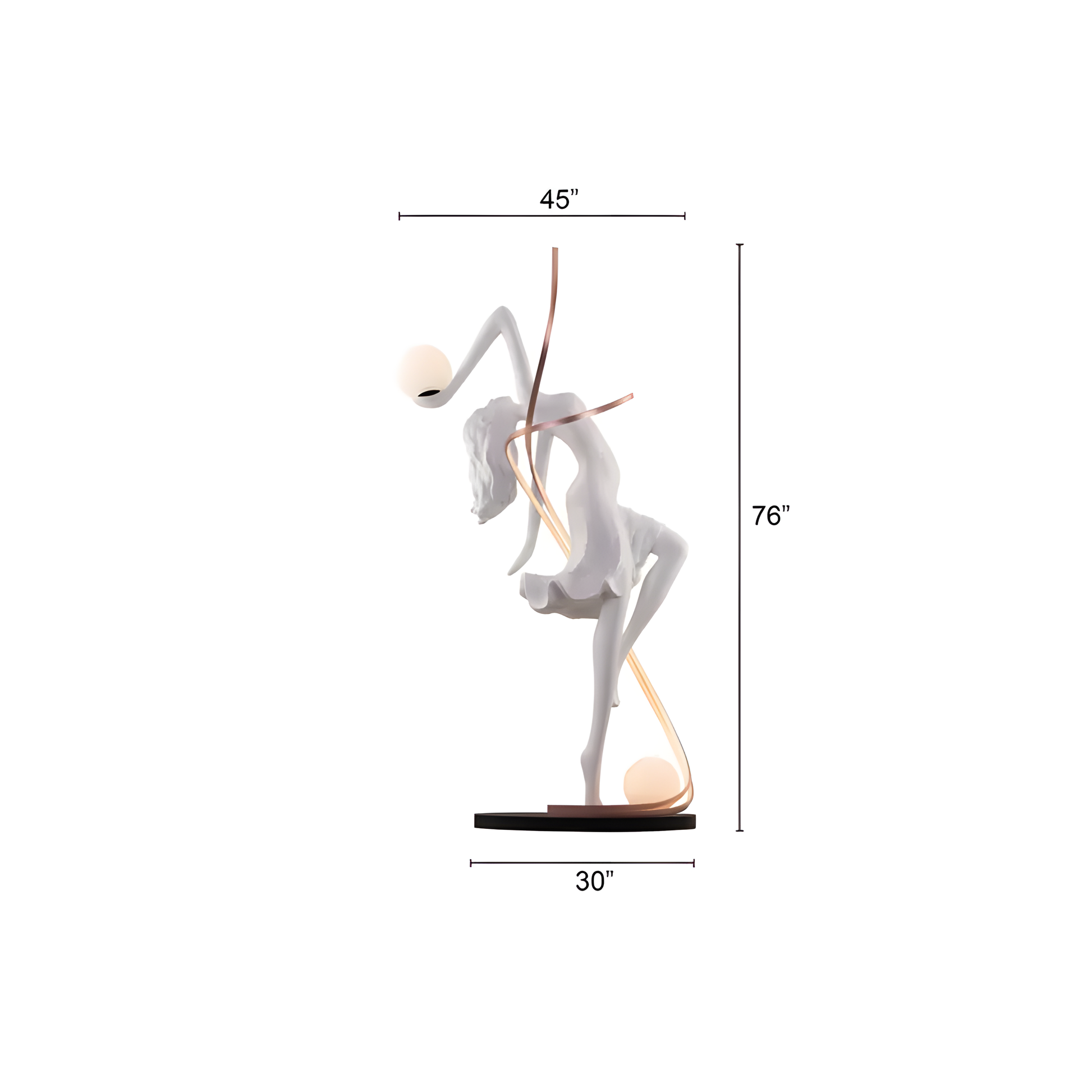 One of the finest works of art to grace The Jhoomar Store Company’s extensive and exquisite collection, Beauty In Bloom is a resplendent sculpture floor lamp that makes your heart skip a beat. Flaunting a graceful dancer taking her stance, this exceptional white floor lamp paints your decor with its timeless elegance. The intricately detailed sculpture is crafted out of resin, and the frosted milky white glass orbs exude a warm glow around the white floor lamp. Two sleek aluminium LED diffusers complement and complete the look effortlessly.