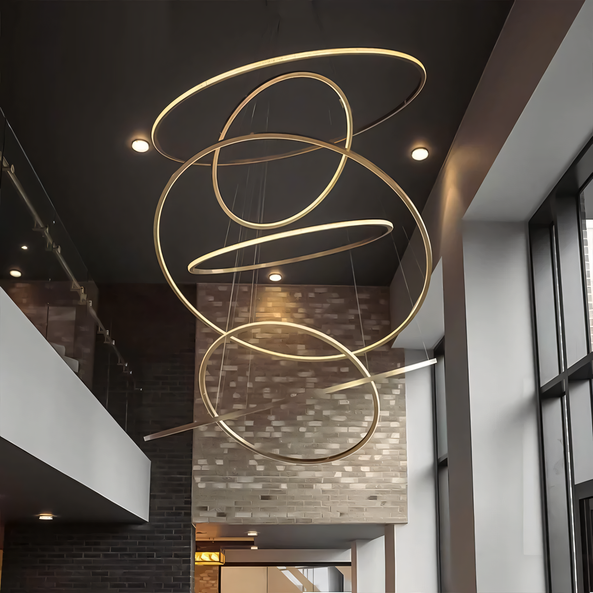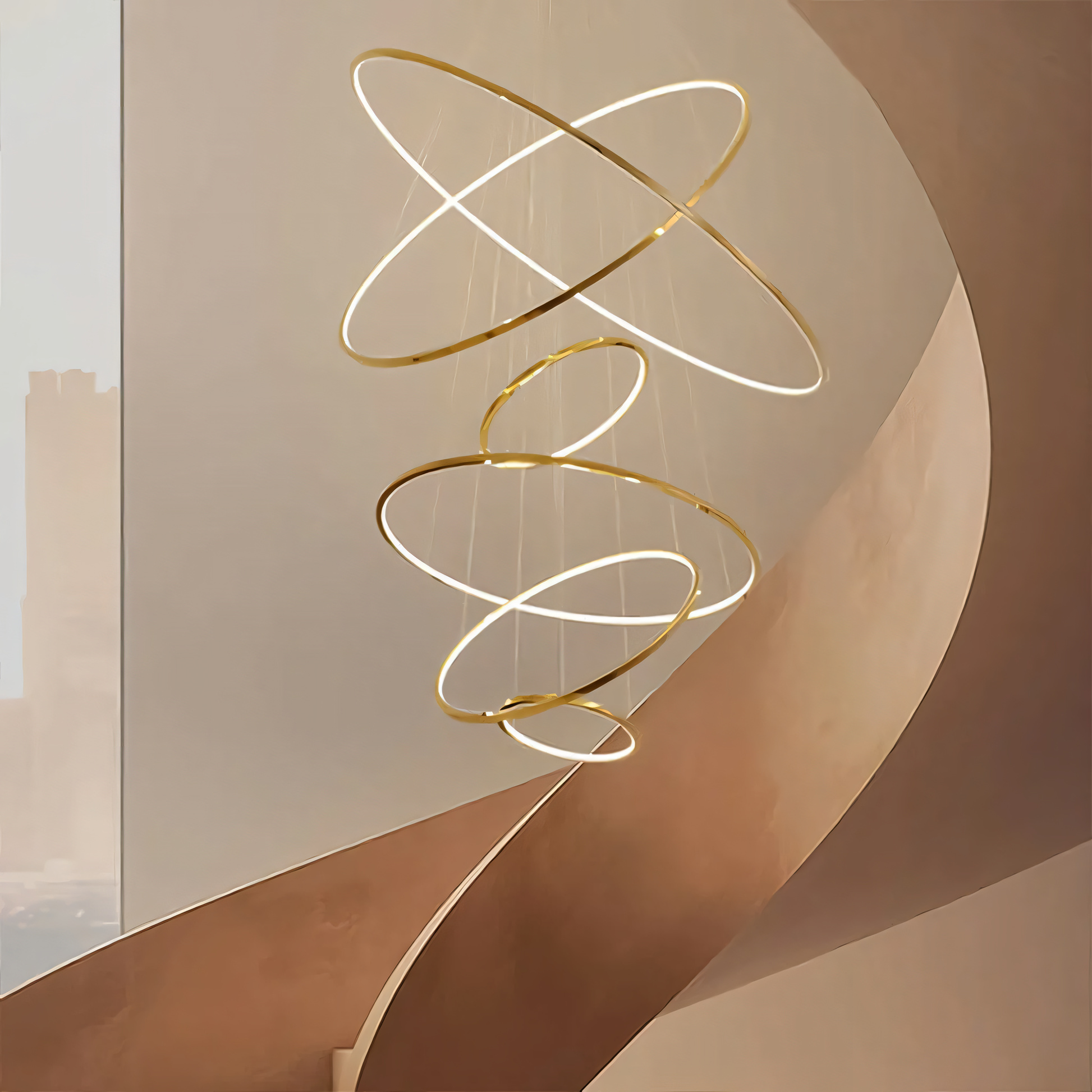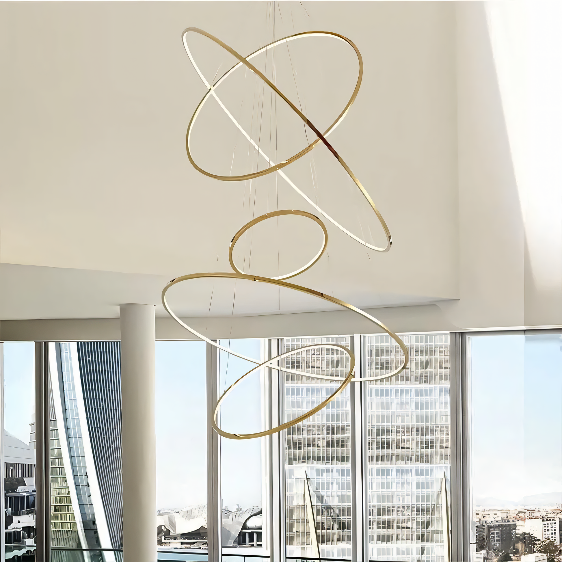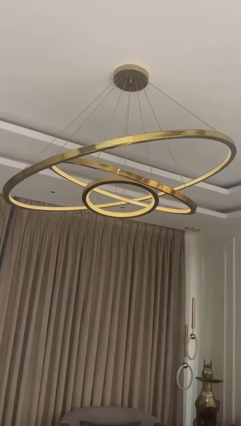 Sculptural Brilliance: Elevate your space with the Nehza Ring Chandelier, a captivating display of multiple rings designed to redefine modern elegance. The sculptural brilliance of this chandelier transforms any room into a statement of contemporary sophistication.