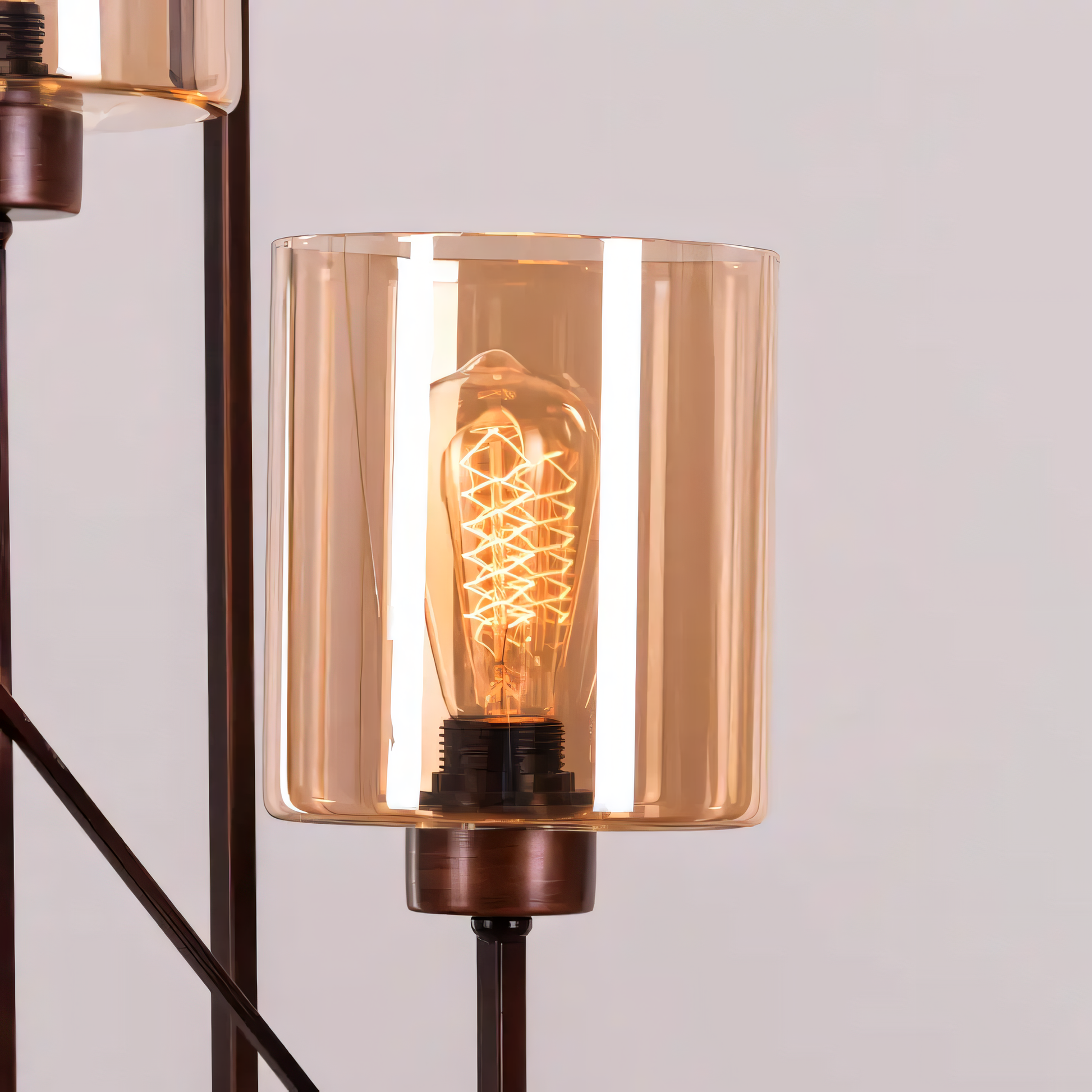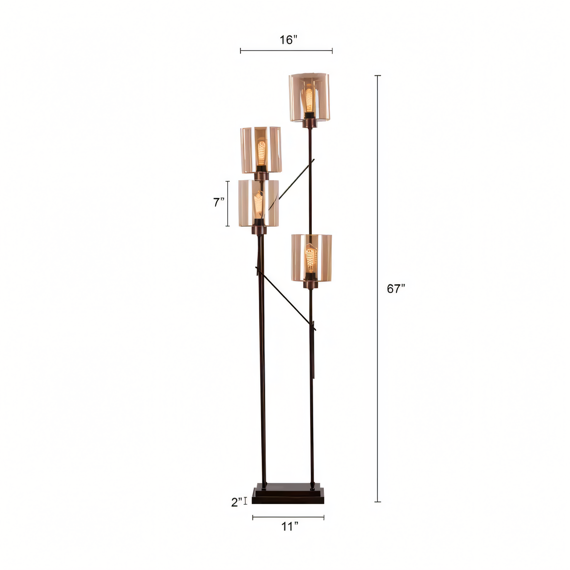 A beautiful, tall floor lamps that is resplendent in the antique coffee hues of its beautiful frame. The incredible metal floor lamp with glass shade brings an old-world charm to your space with its antique finish. The LED floor lamp flaunts a sleek and slender metal frame that gracefully holds four hurricane glass shades with an amber tint. Harmony of light and design, this antique finish floor lamp is a must-have in a beautiful home.