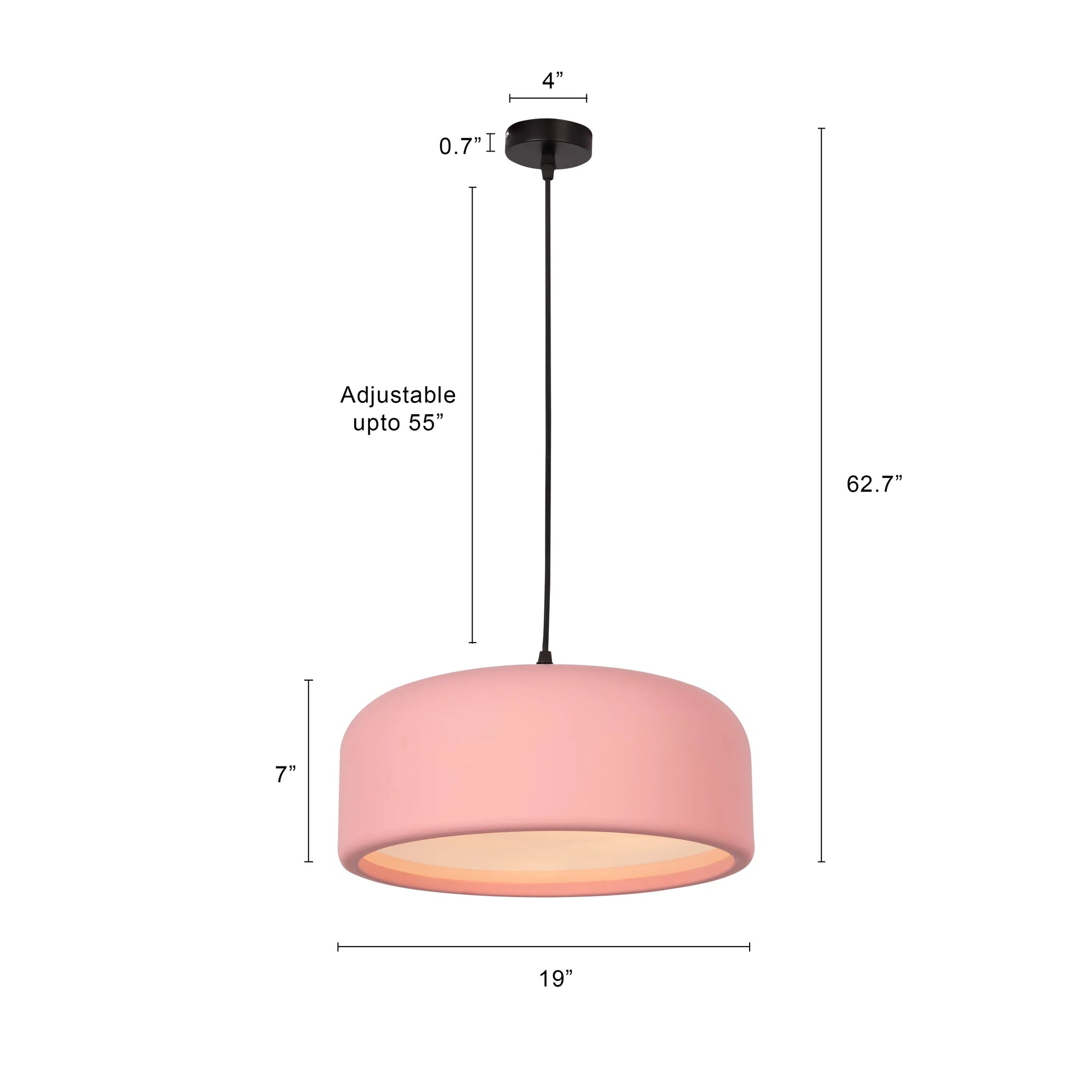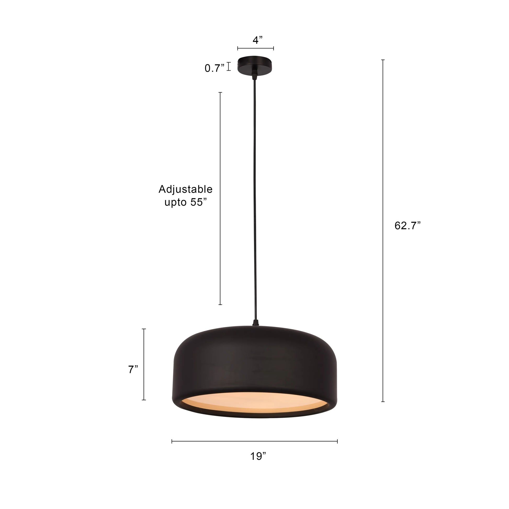 | Product Dimensions | Overall Dimensions- Height: Upto 62.7” Frame Dimensions- Height: 7” Diameter: 19” Ceiling Cup Dimensions- Height: 0.7" Diameter: 4” Cord Length: 55"(Adjustable) |