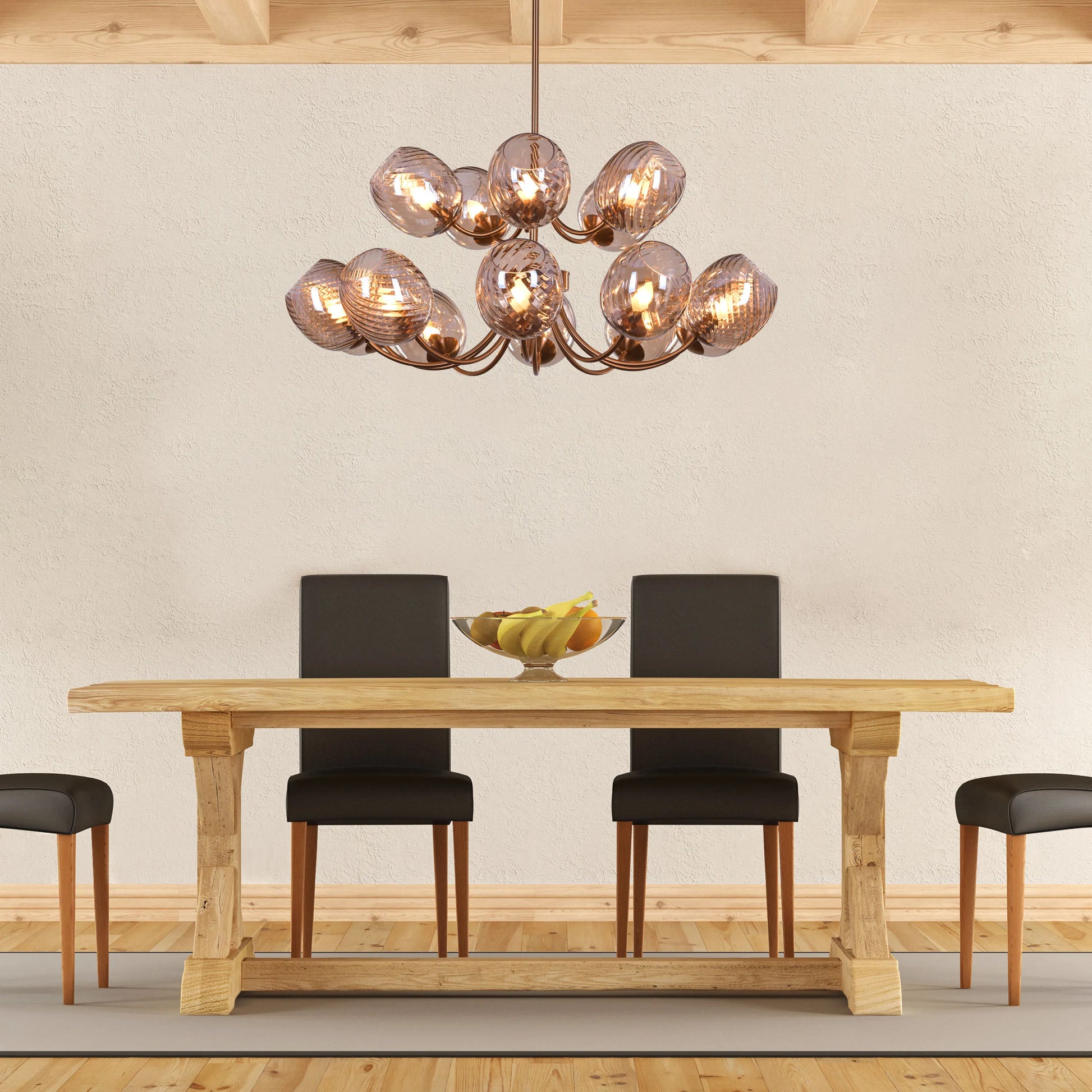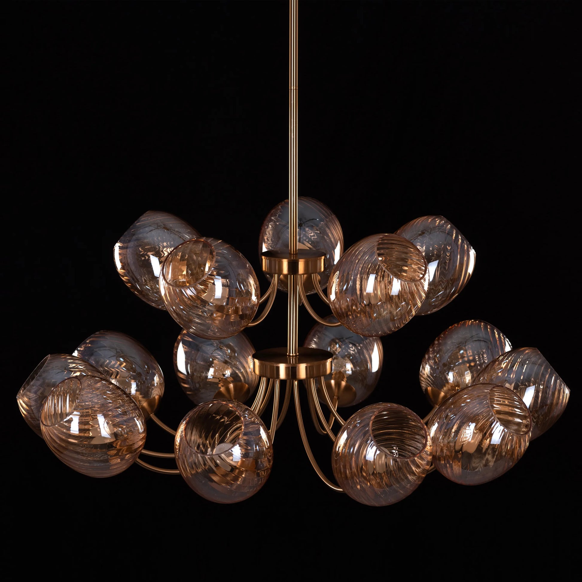 One of the standout features of this chandelier is its meticulous craftsmanship. The gold framework is intricately designed to support the amber glass elements, creating a harmonious and visually appealing structure. The amber glass pieces reflect light beautifully, casting a warm, inviting glow throughout your space. This chandelier not only provides ample illumination but also serves as a captivating focal point in any room.