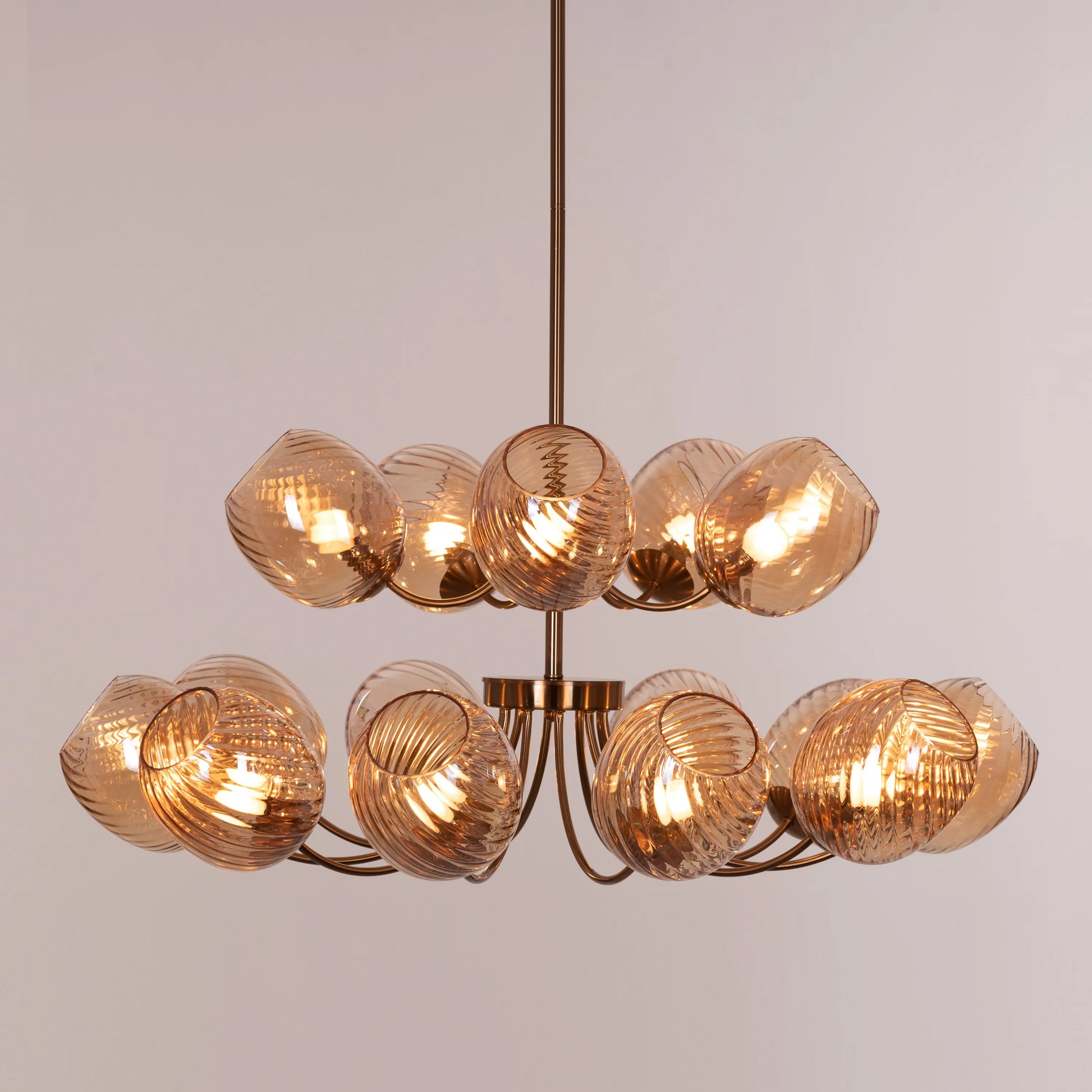 The Backstage Glow Chandelier features a stunning gold finish that exudes a sense of grandeur. Its large size makes it perfect for expansive spaces such as living rooms, dining areas, and grand foyers. The chandelier's amber glass elements add a touch of warmth and sophistication, creating a welcoming ambiance. The combination of gold and amber ensures it complements a wide range of interior styles, from modern to classic.