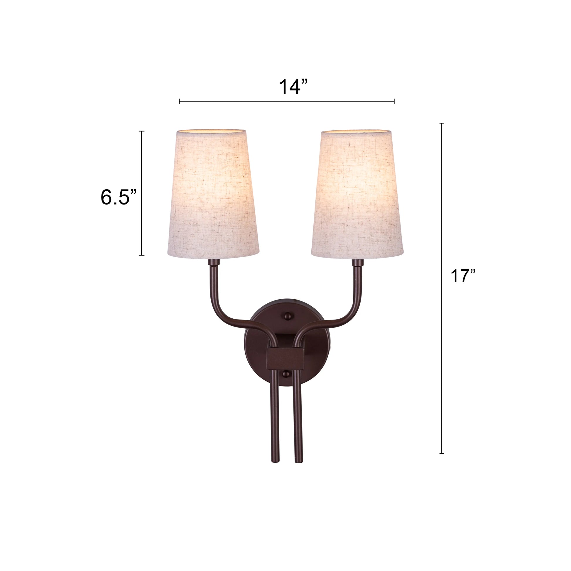 | Product Dimensions | Overall Dimensions- Height: 17" Length: 14" Width: 7.5" Shade Dimension- Height: 6.5" Diameter: 5.5" Wall Plate Dimension- Height: 1" Diameter: 5" |