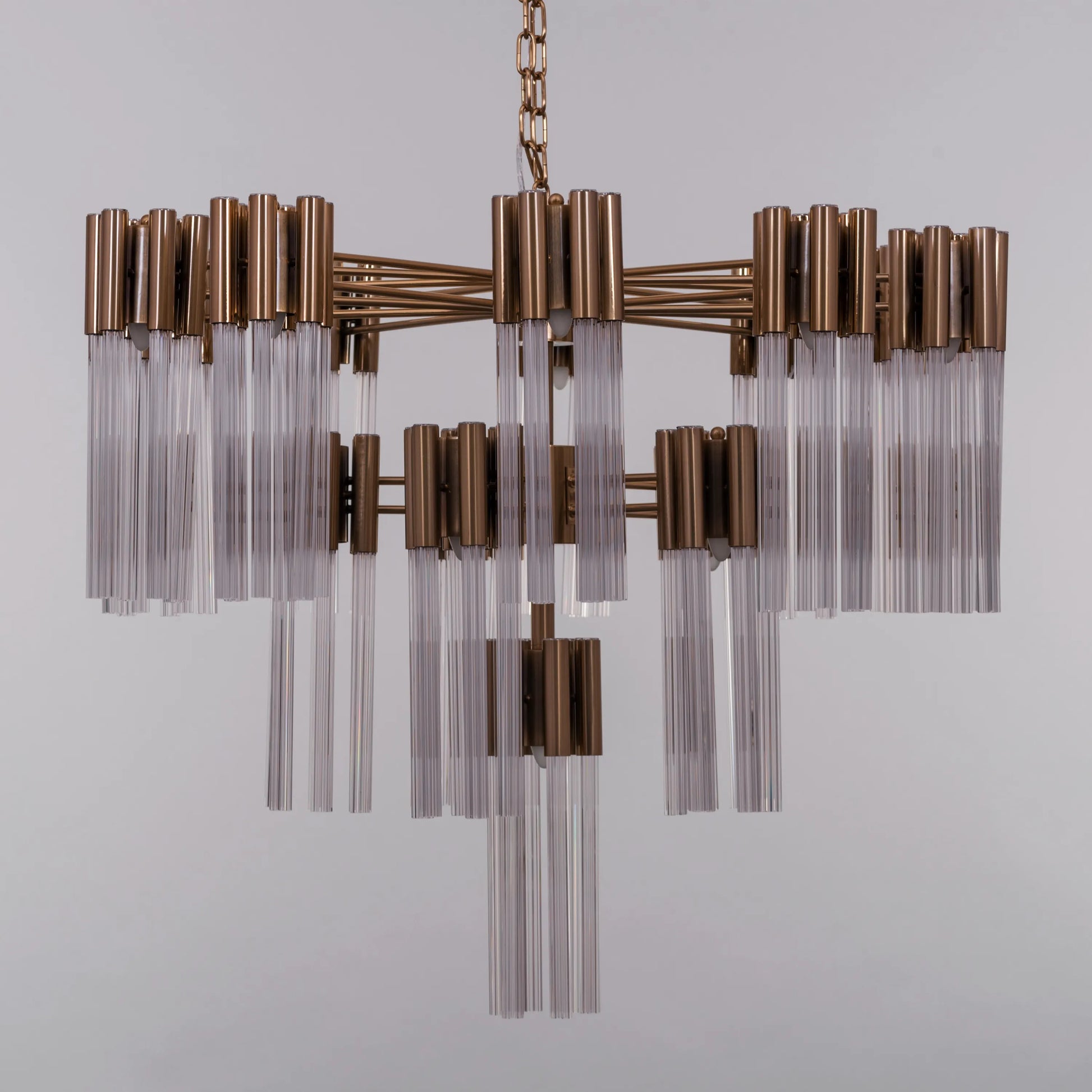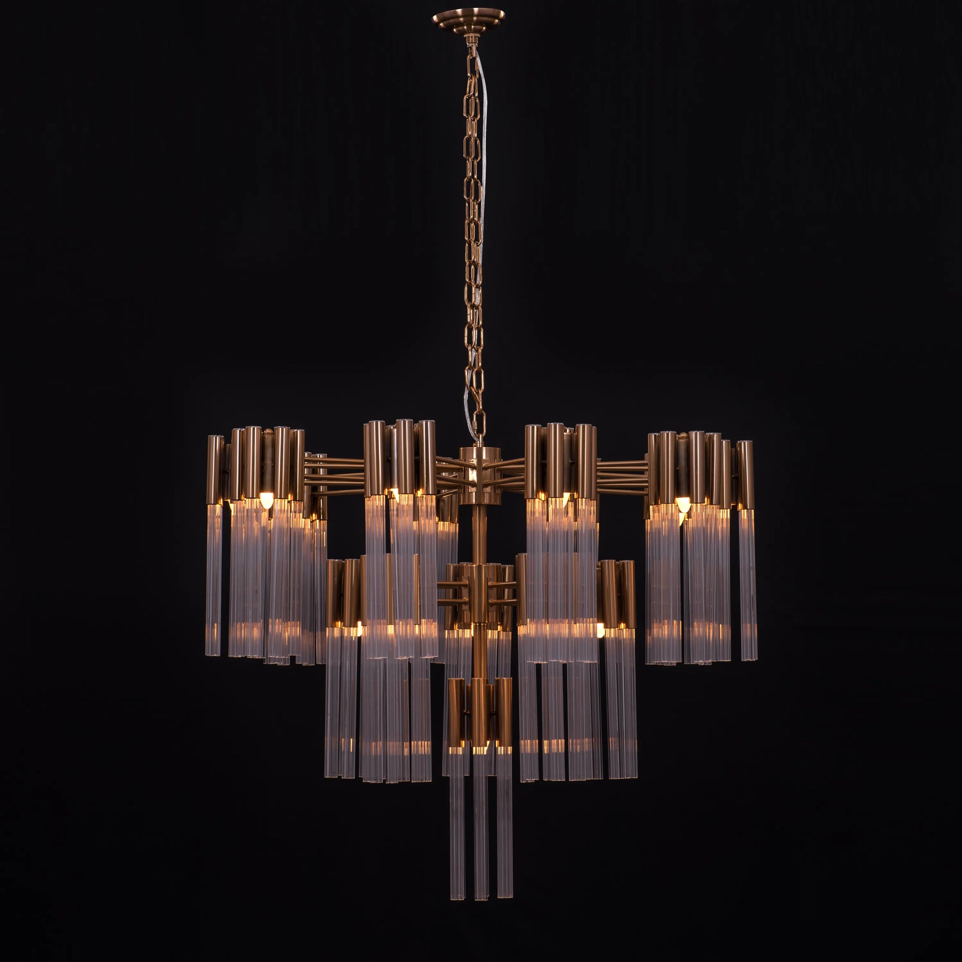 What sets this chandelier apart is its meticulous craftsmanship. The gold framework is expertly designed to support the precision-cut glass tubes, creating a visually striking structure. Each tube is carefully positioned to maximize light reflection, casting a radiant and inviting glow throughout your space. The chandelier's gold finish enhances its elegance, making it a versatile piece that complements various interior styles.