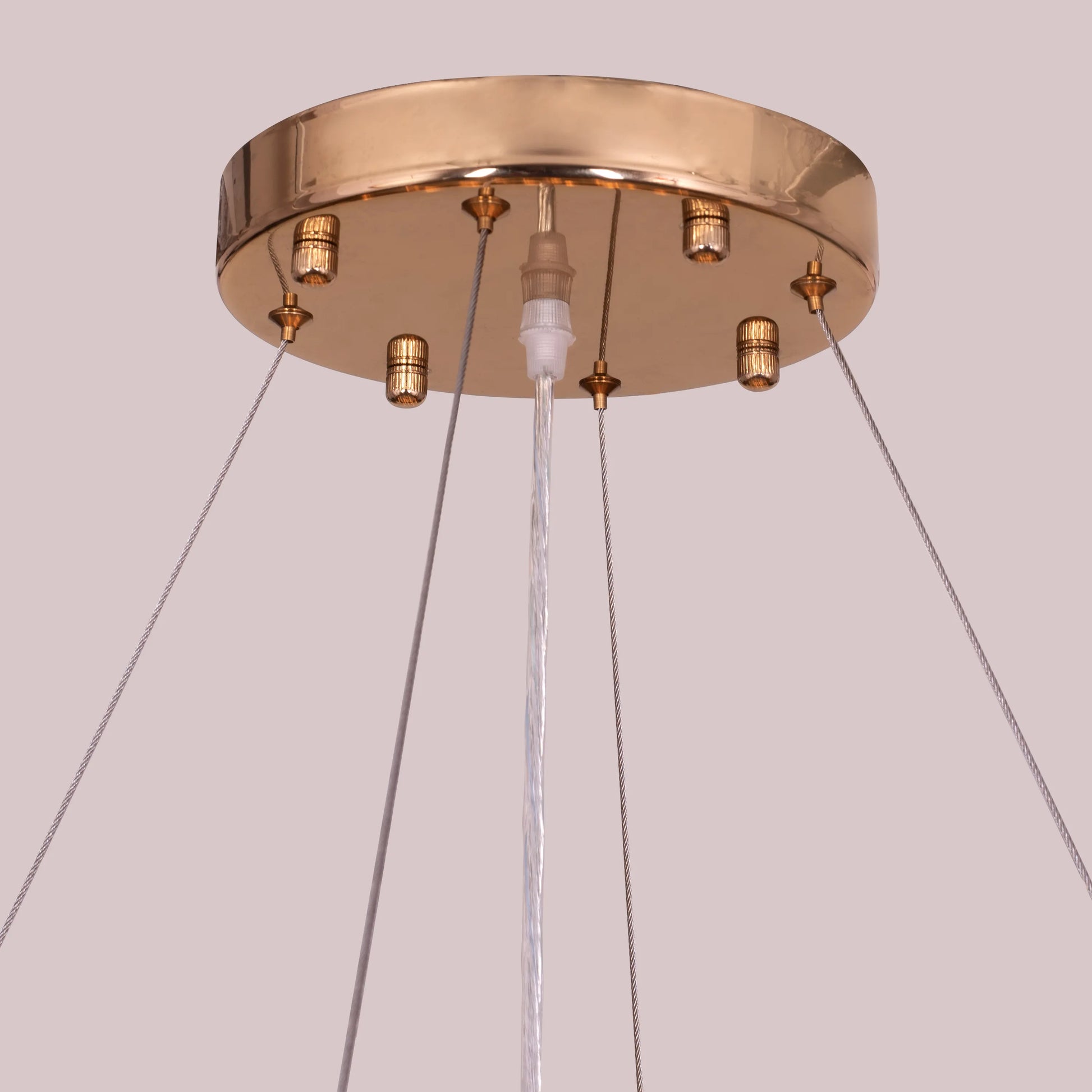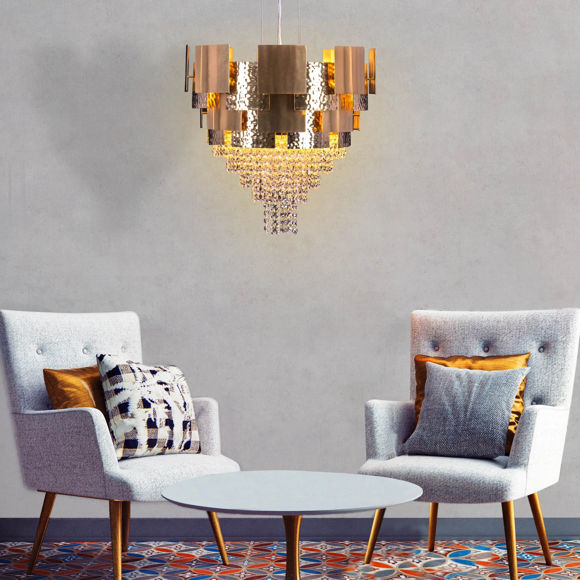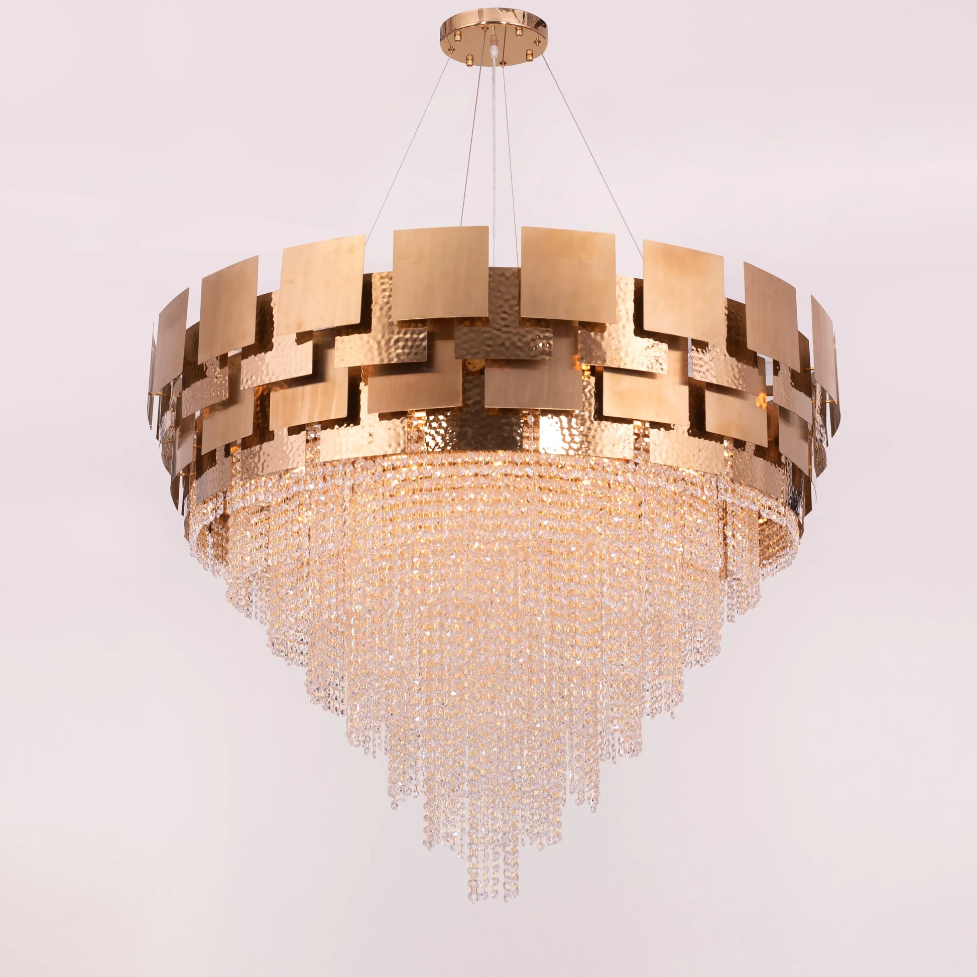 The chandelier is ideal for various spaces, including dining rooms, living areas, and grand entryways. Its elegant finish adds a touch of warmth and sophistication, ensuring it complements a variety of interior styles from traditional to contemporary. The intricate design and precision-cut crystals reflect light beautifully, creating a dazzling display that brightens any space.