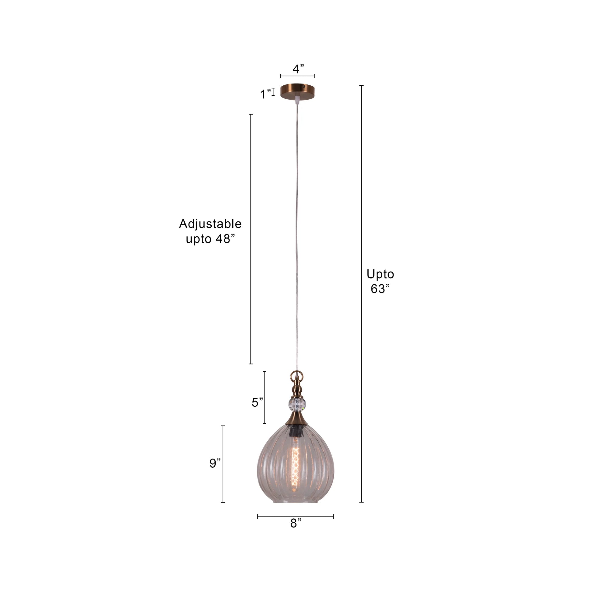 | Product Dimensions | Overall Dimensions- Height: Upto 63" Length: 8" Width: 8" Shade Dimension- Height: 9" Diameter: 8" Ceiling Cup Dimension- Height: 1" Diameter: 4" Cord Length: 48" |