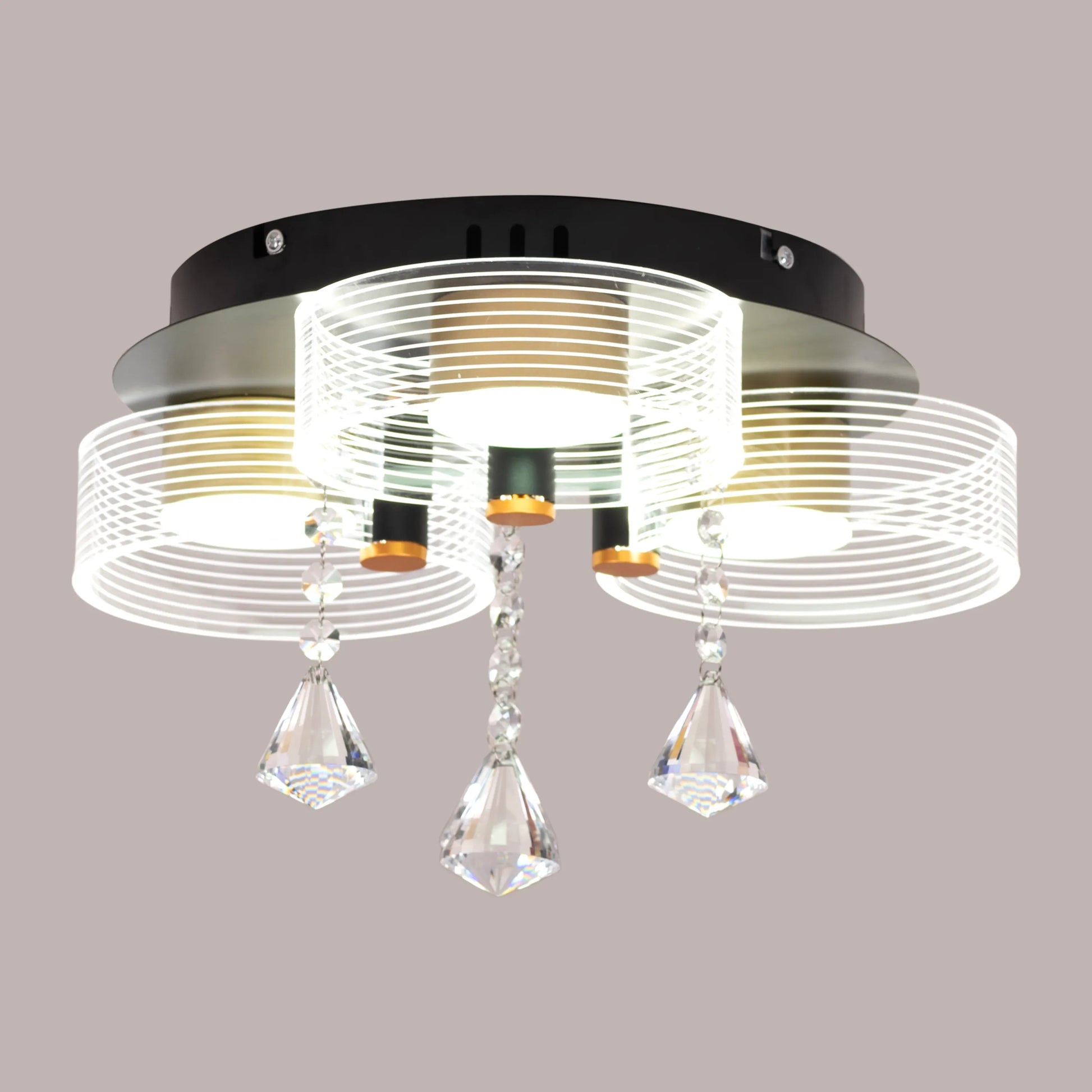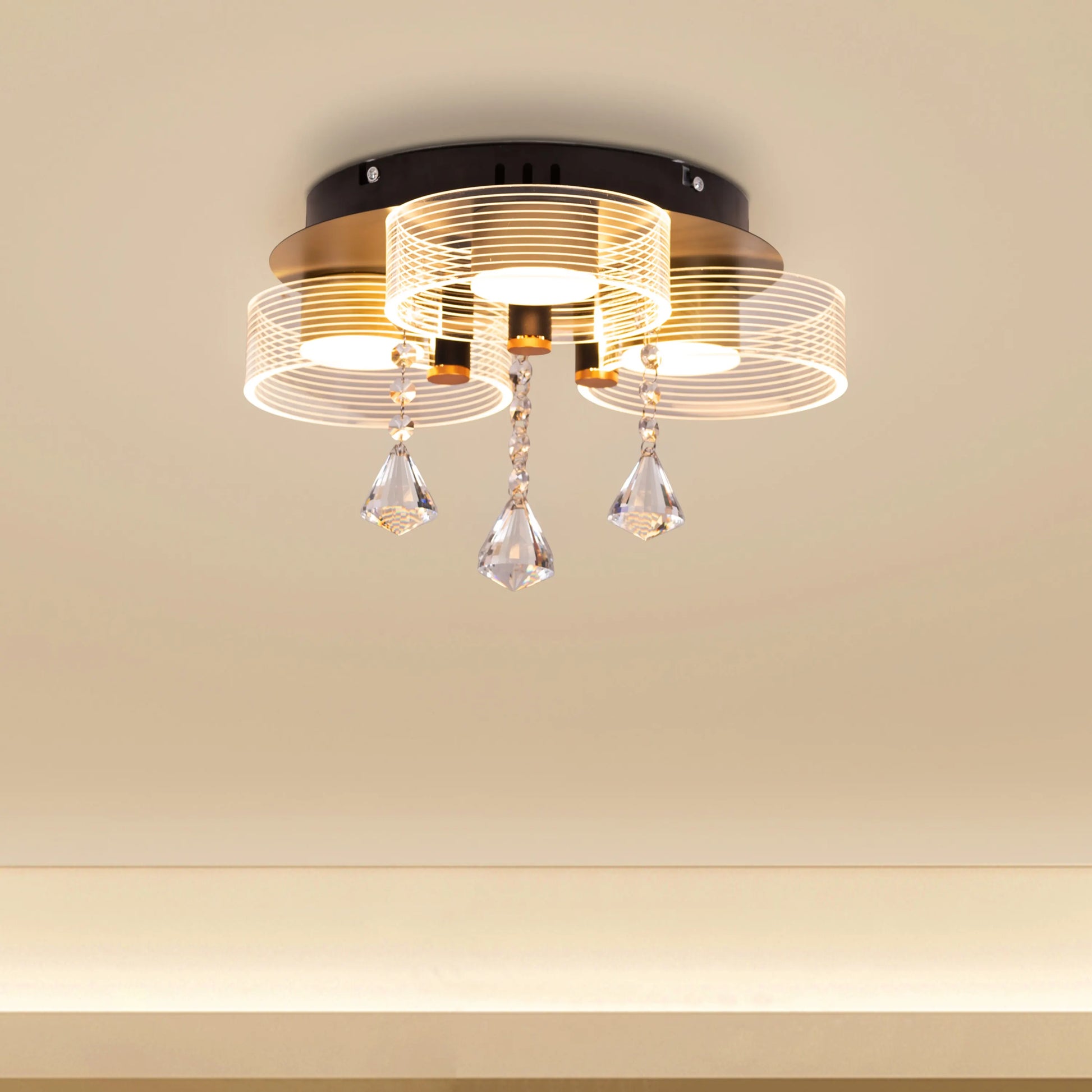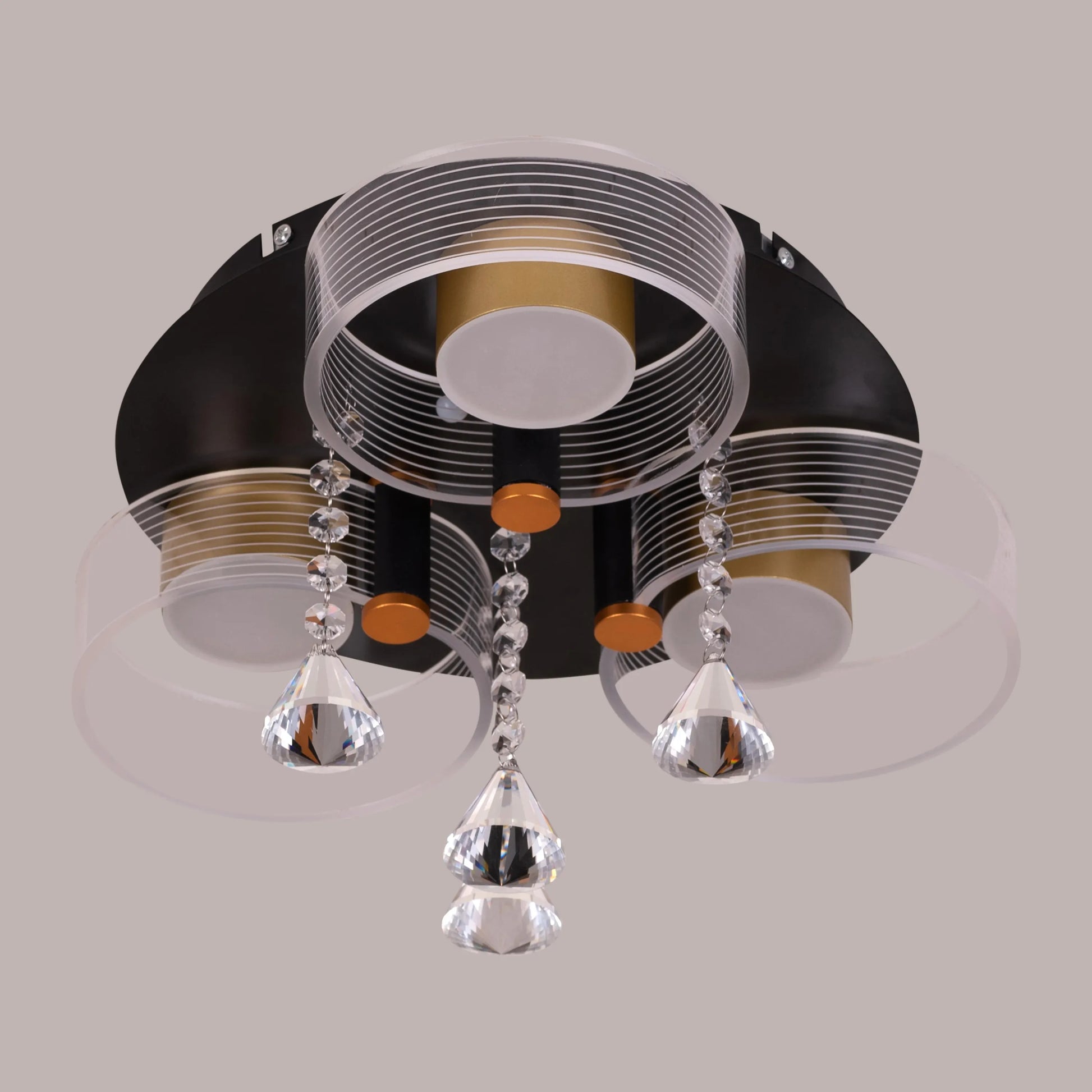 The Meet And Greet (Gold, Dimmable LED with Remote Control, 3 Head) Crystal Ceiling Light is more than just a lighting solution – it's a statement piece that reflects your taste for luxury and appreciation of fine design. It's perfect for making a grand impression in entrance halls, adding glamour to dining rooms, or creating a luxurious atmosphere in master bedrooms.