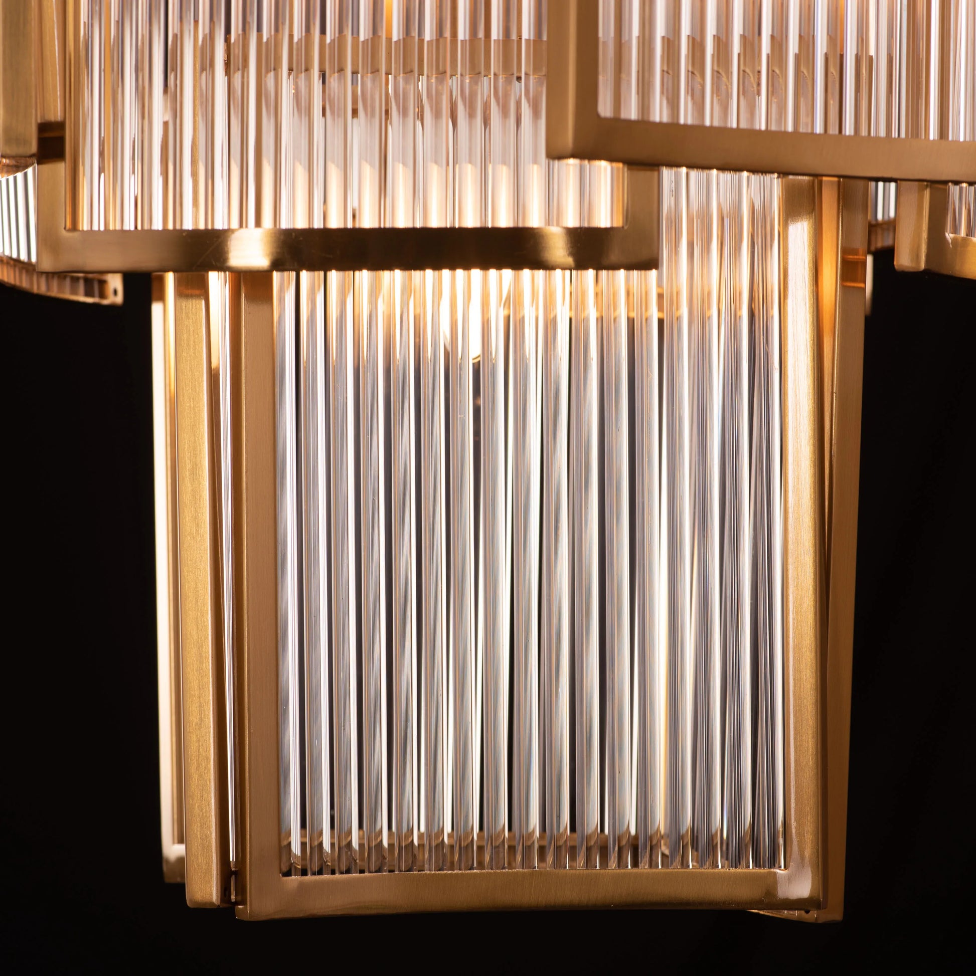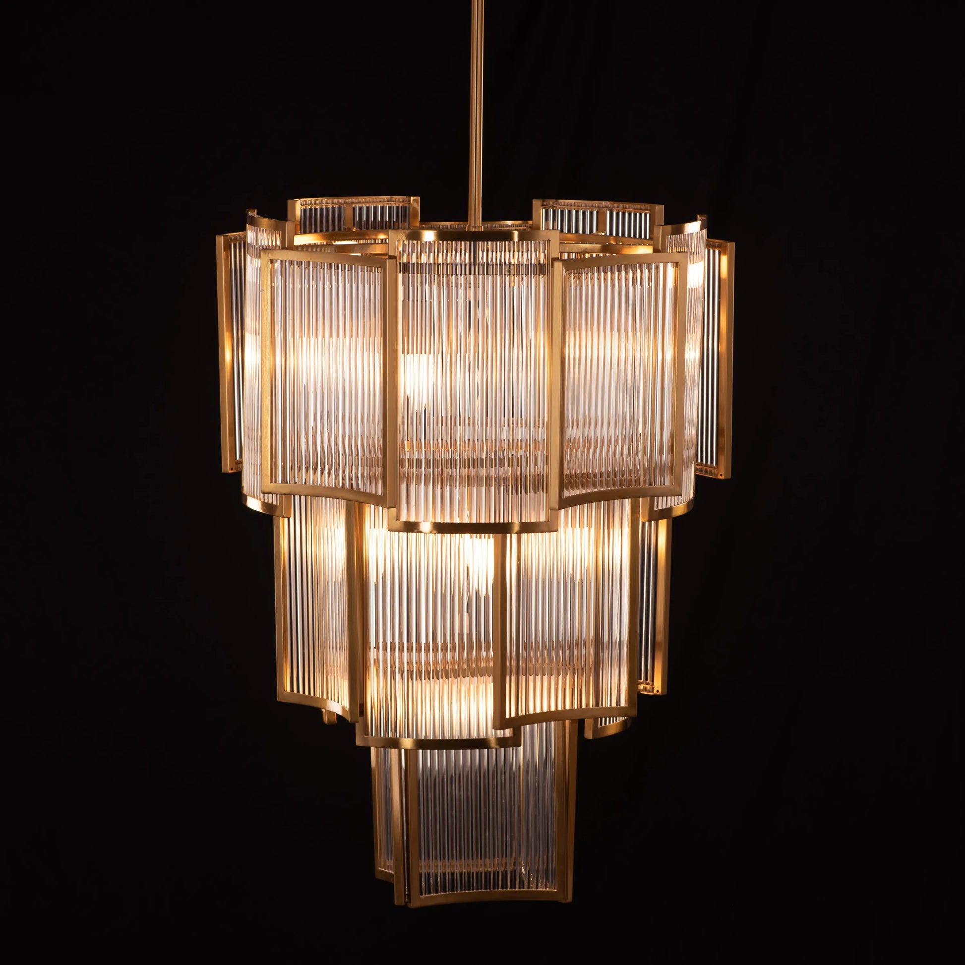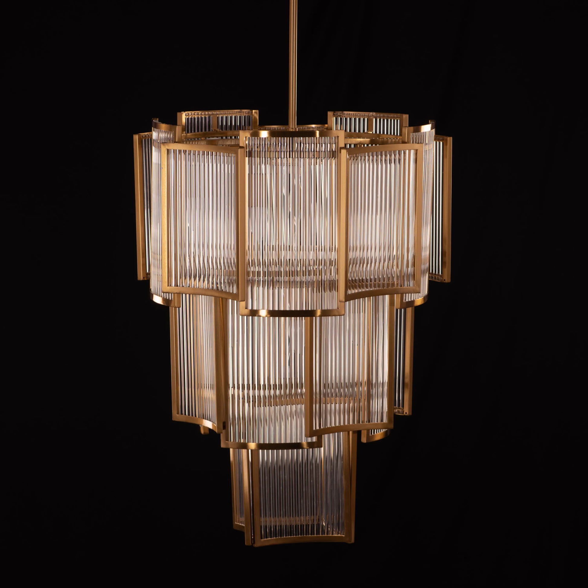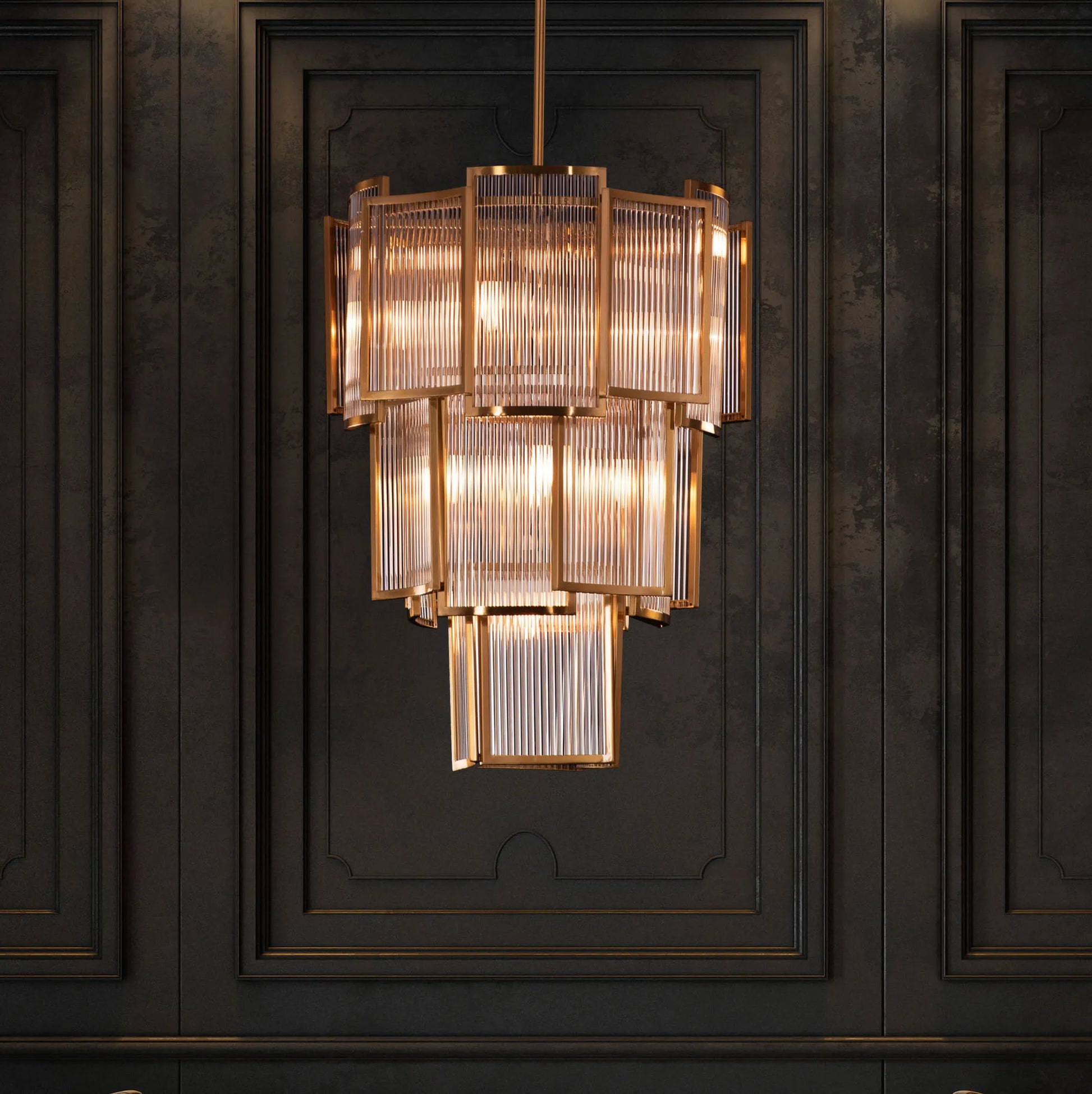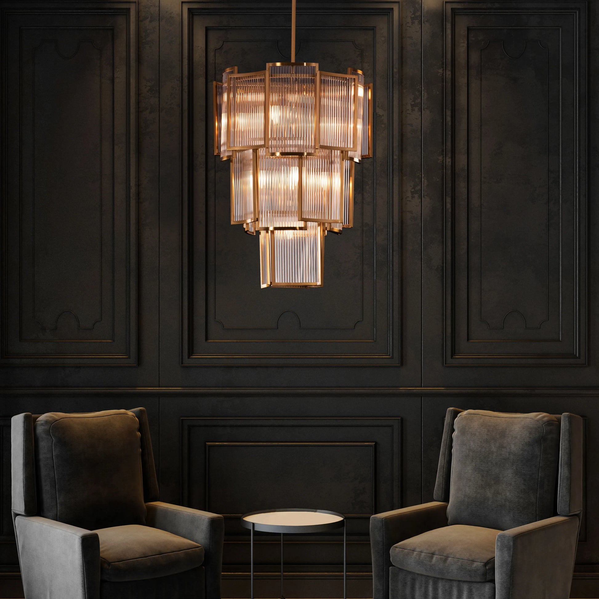 Multiple tiers of crystals cascade downward, creating a waterfall effect that catches and refracts light in mesmerizing ways. Each crystal is precisely cut and polished to maximize its light-reflecting properties, ensuring that the chandelier sparkles from every angle. The varying sizes and shapes of the crystals add depth and dimension to the overall design, creating a captivating visual display even when the chandelier is not illuminated.