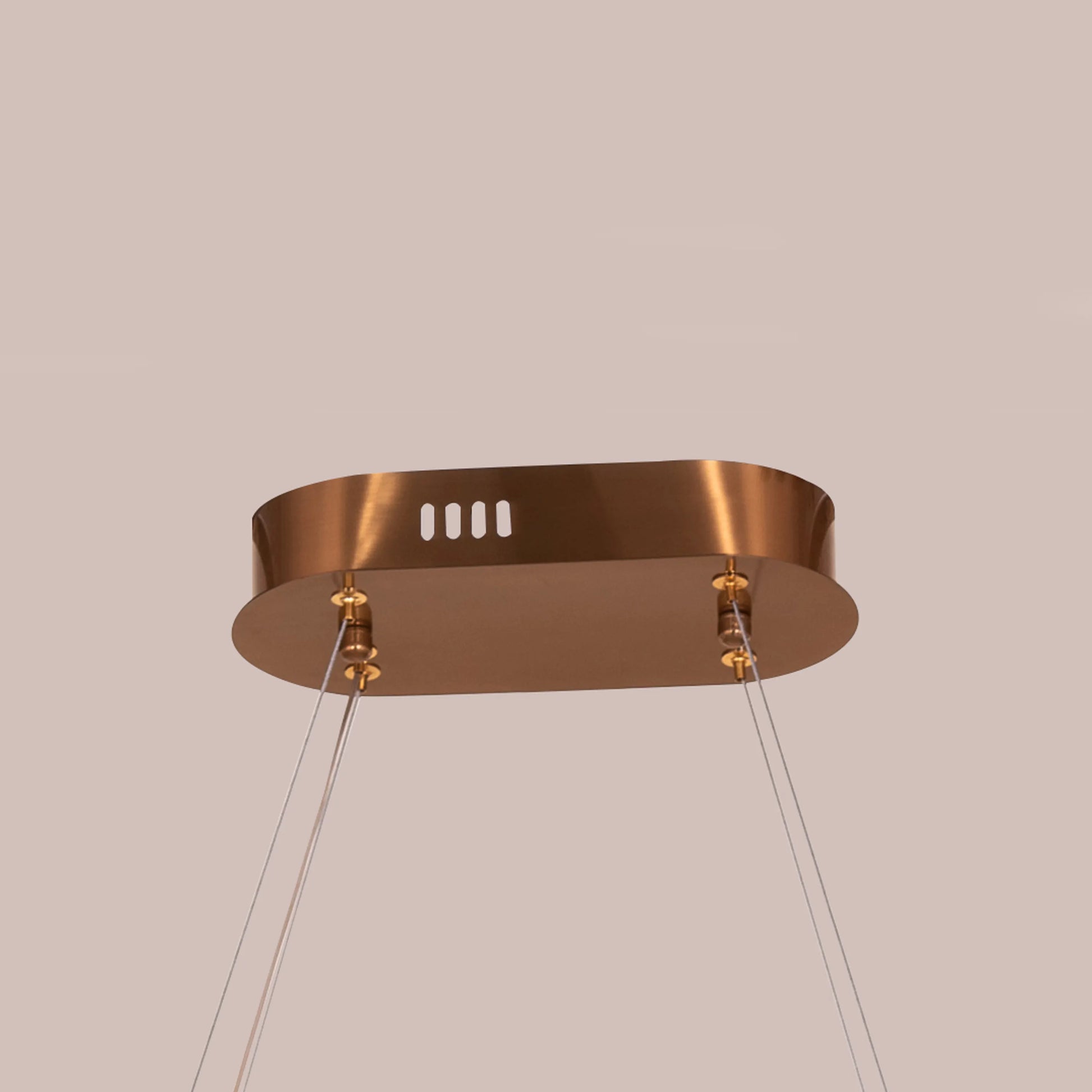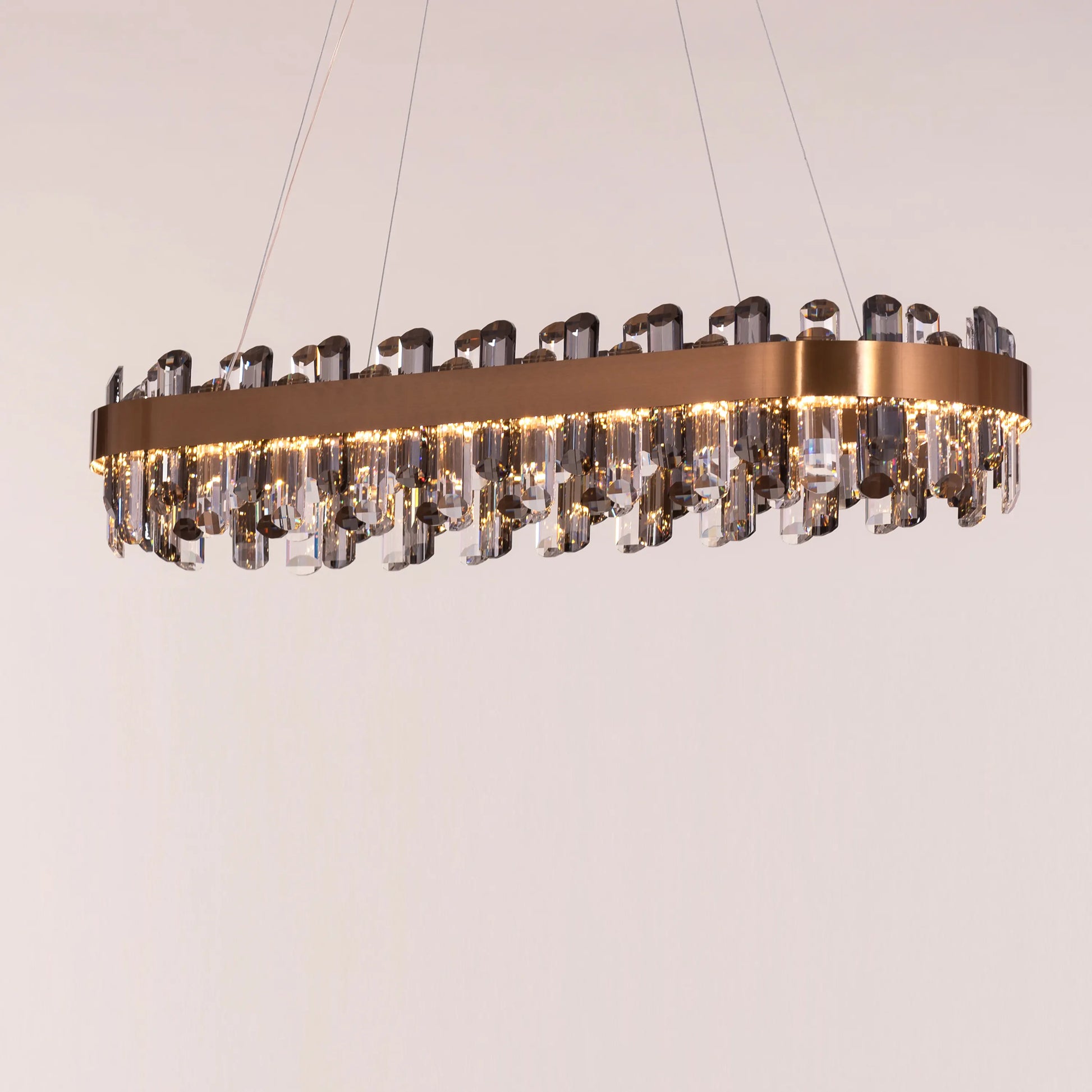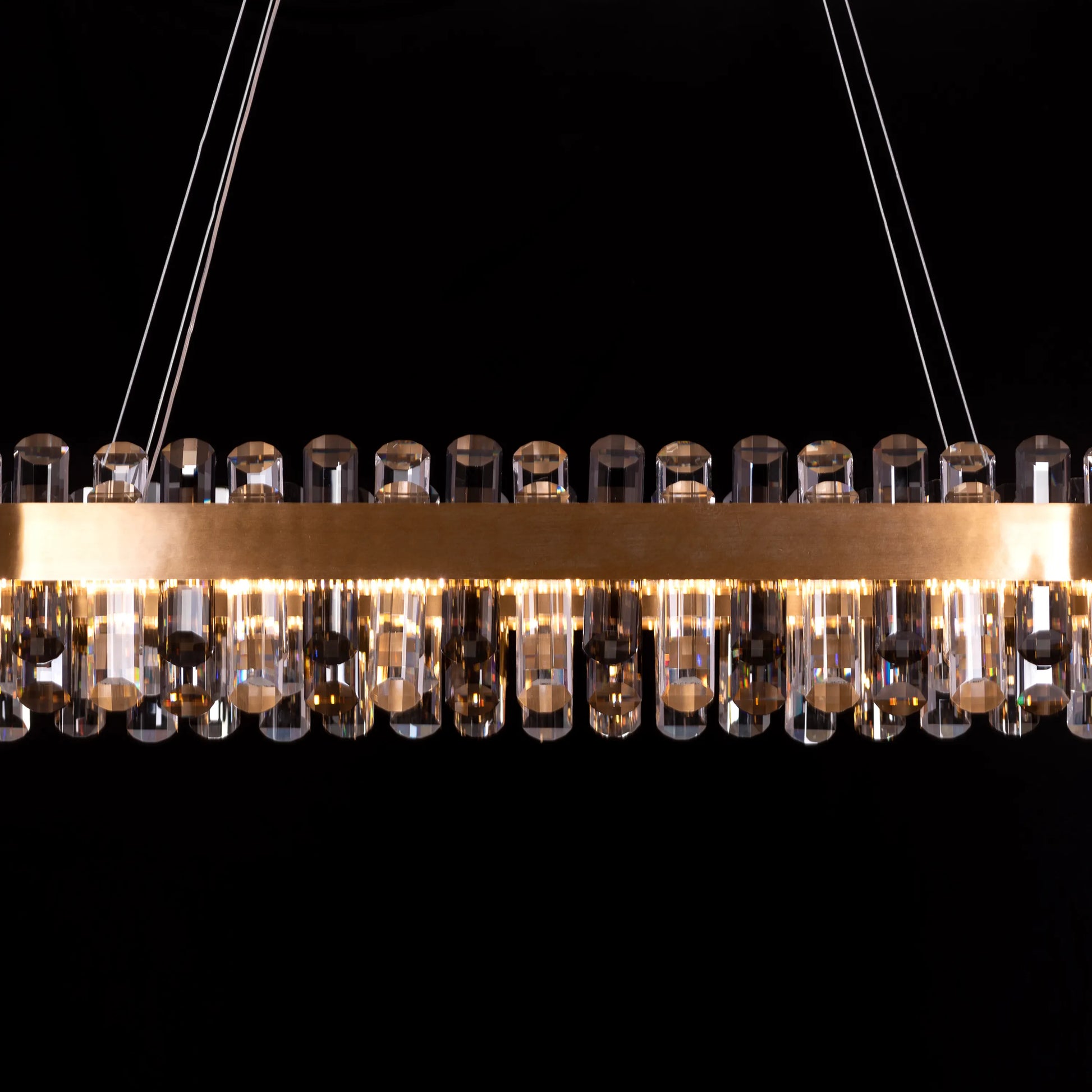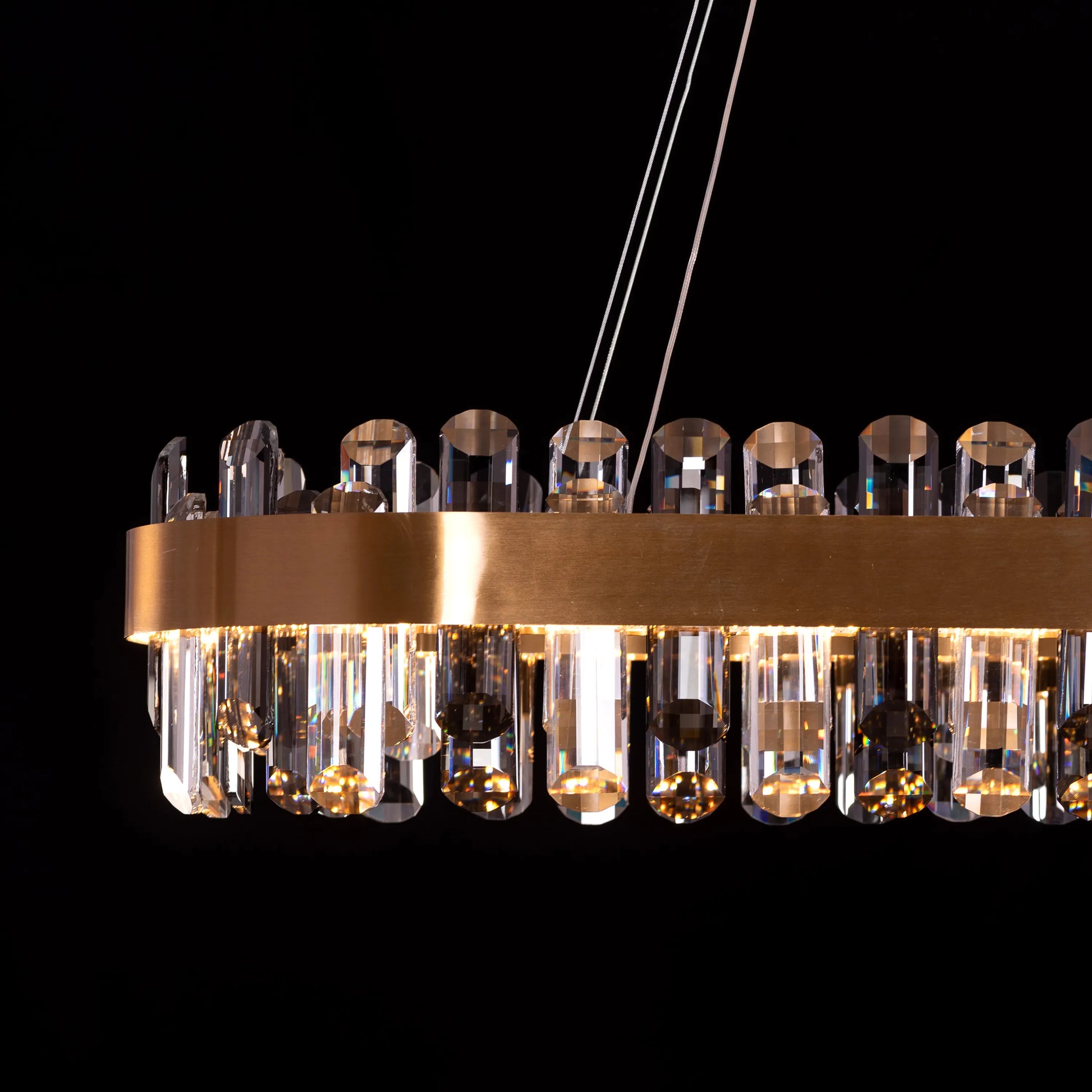At the heart of the Start From Scratch chandelier is a sleek, gold-finished frame that exudes a refined, contemporary aesthetic. Suspended from this sturdy structure is a striking oval arrangement of expertly cut crystal glass, each facet strategically positioned to refract and reflect the warm, inviting glow of the LED lighting system.