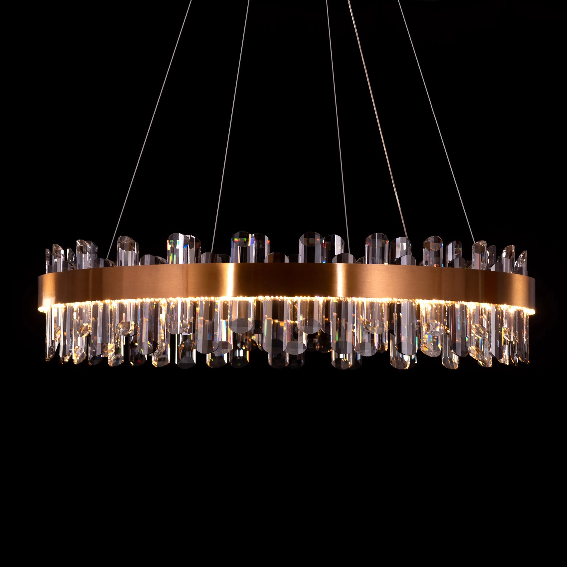 The Start From Scratch Chandelier is built to last, matching its innovative design with enduring quality. The chandelier's structure is crafted from premium materials, ensuring stability and longevity. The gold finish is not only visually stunning but also resistant to tarnishing and wear, maintaining its luster over time. The crystals are securely attached, designed to withstand the test of time while continuing to sparkle brilliantly.