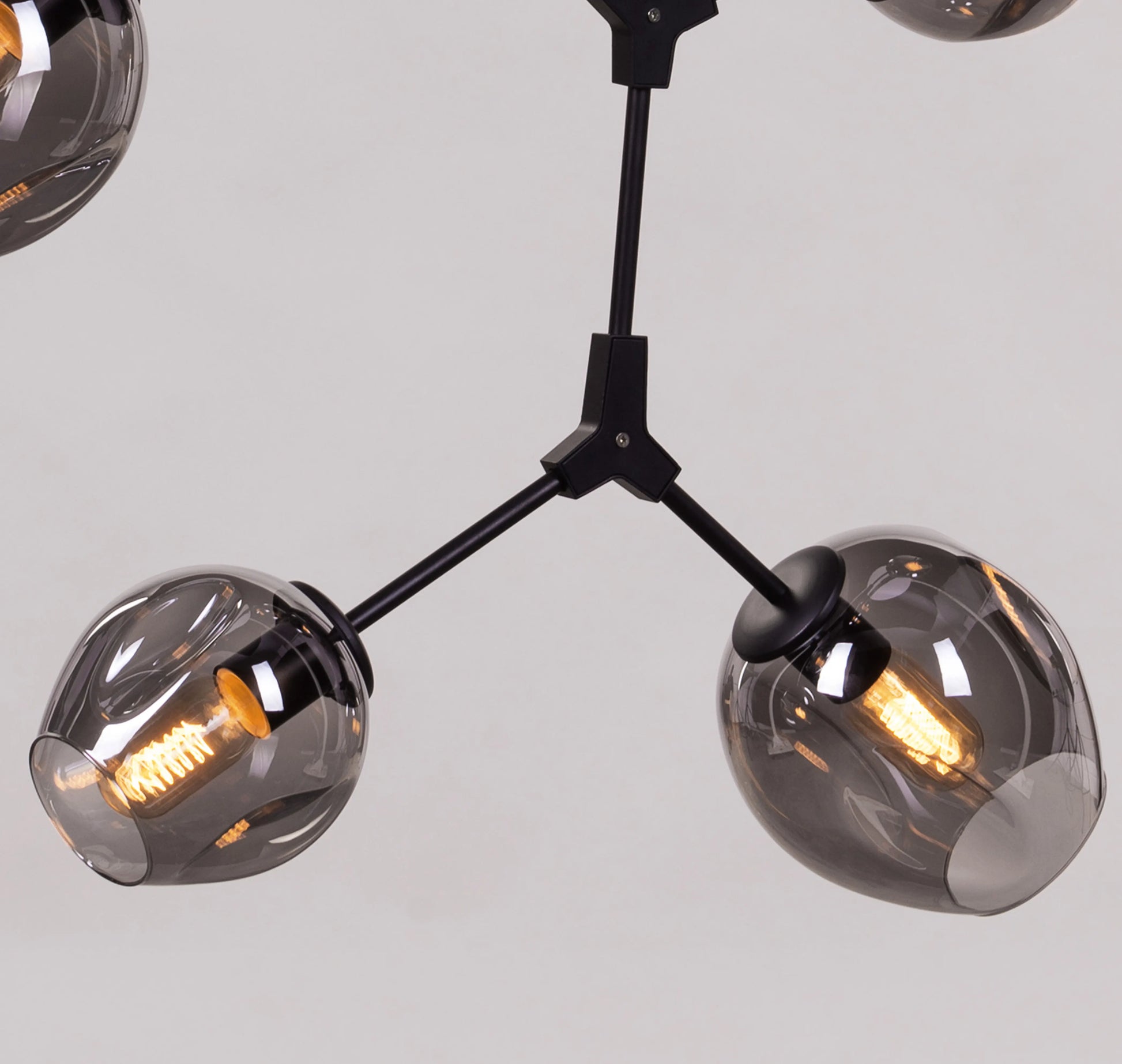 Smokey Grey Glass Heads: The chandelier's glass heads are crafted in a sophisticated smokey grey hue, providing a subtle contrast to the black frame. This color palette adds depth and drama to the chandelier’s appearance, making it an ideal choice for those looking to make a stylish statement.