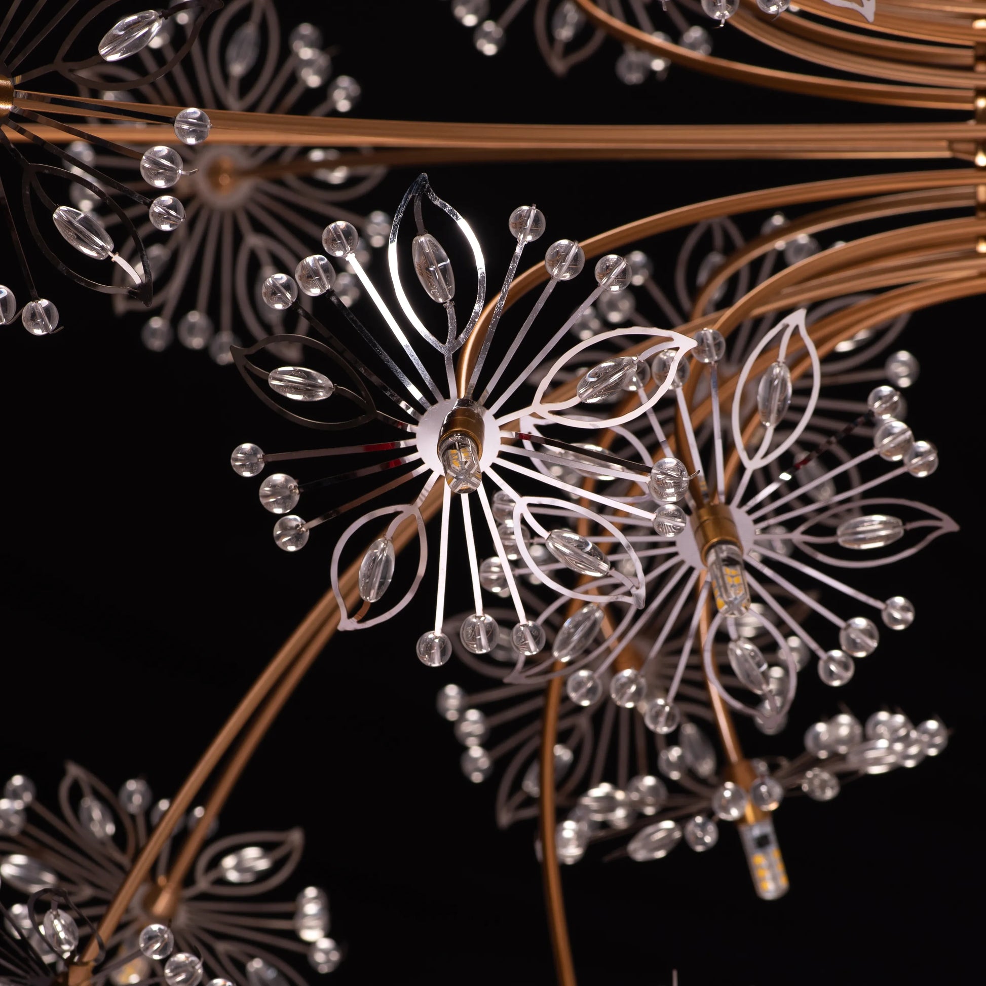 Suspended from a sleek, gold-finished frame, the Weekend Vibes chandelier features an array of delicate, cascading crystal glass droplets that refract and reflect light in mesmerizing patterns. As the chandelier is illuminated, the crystals come alive, casting a warm, inviting glow that instantly transforms the atmosphere of the room.