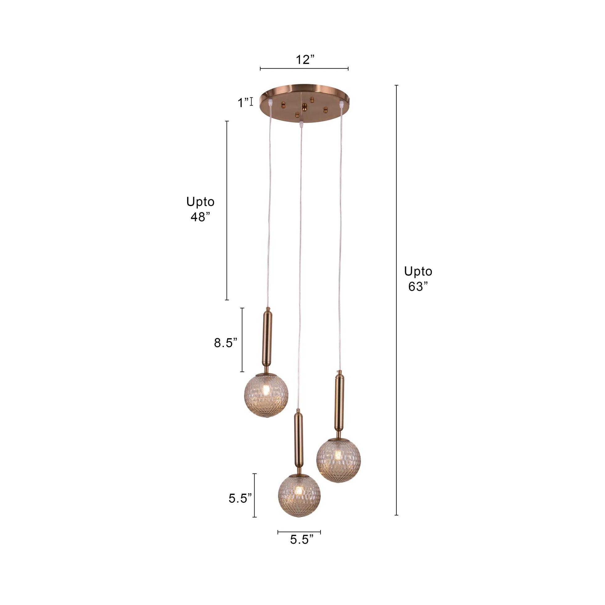 | Product Dimensions | Overall Dimensions- Height: Upto 63" Length: 14" Width: 14" Frame Dimension- Glass Globe Diameter: 5.5" Ceiling Plate Dimensions- Height: 1" Diameter: 12" Cord Length: Adjustable upto 48" |