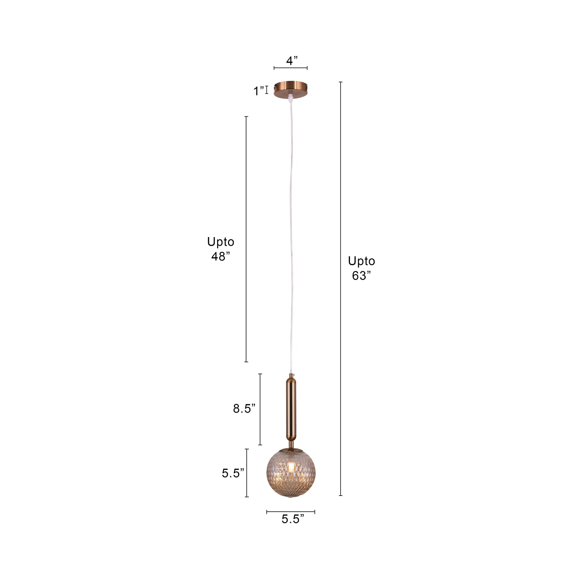 | Product Dimensions | Overall Dimensions- Height: Upto 63" Length: 5.5" Width: 5.5" Frame Dimension- Glass Globe Diameter: 5.5" Ceiling Plate Dimensions- Height: 1" Diameter: 4" Cord Length: Adjustable upto 48" |